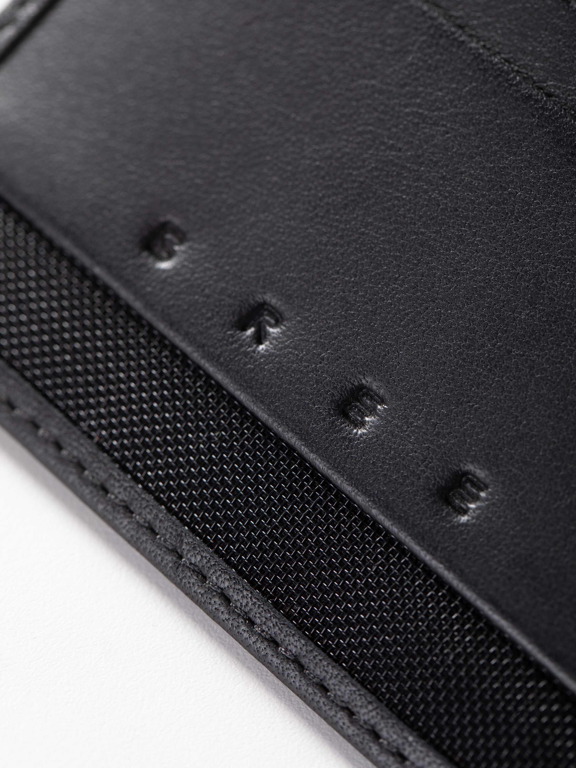 Made from high-quality cowhide leather with a natural texture. The surface has a matte and refined appearance, complemented by a black mesh detail that gives the case a light, functional texture.