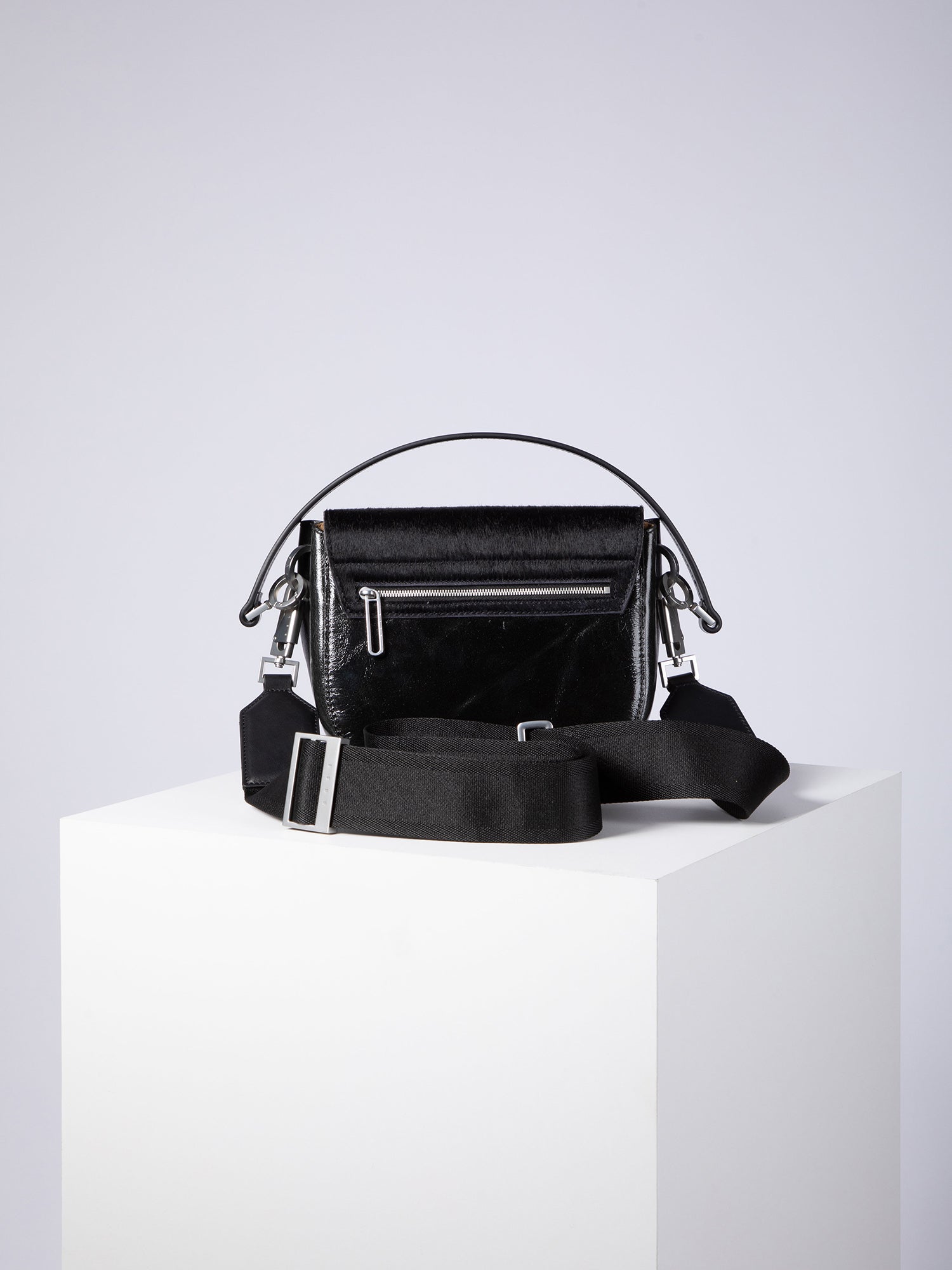 - Material:High-gloss leather with fur flap