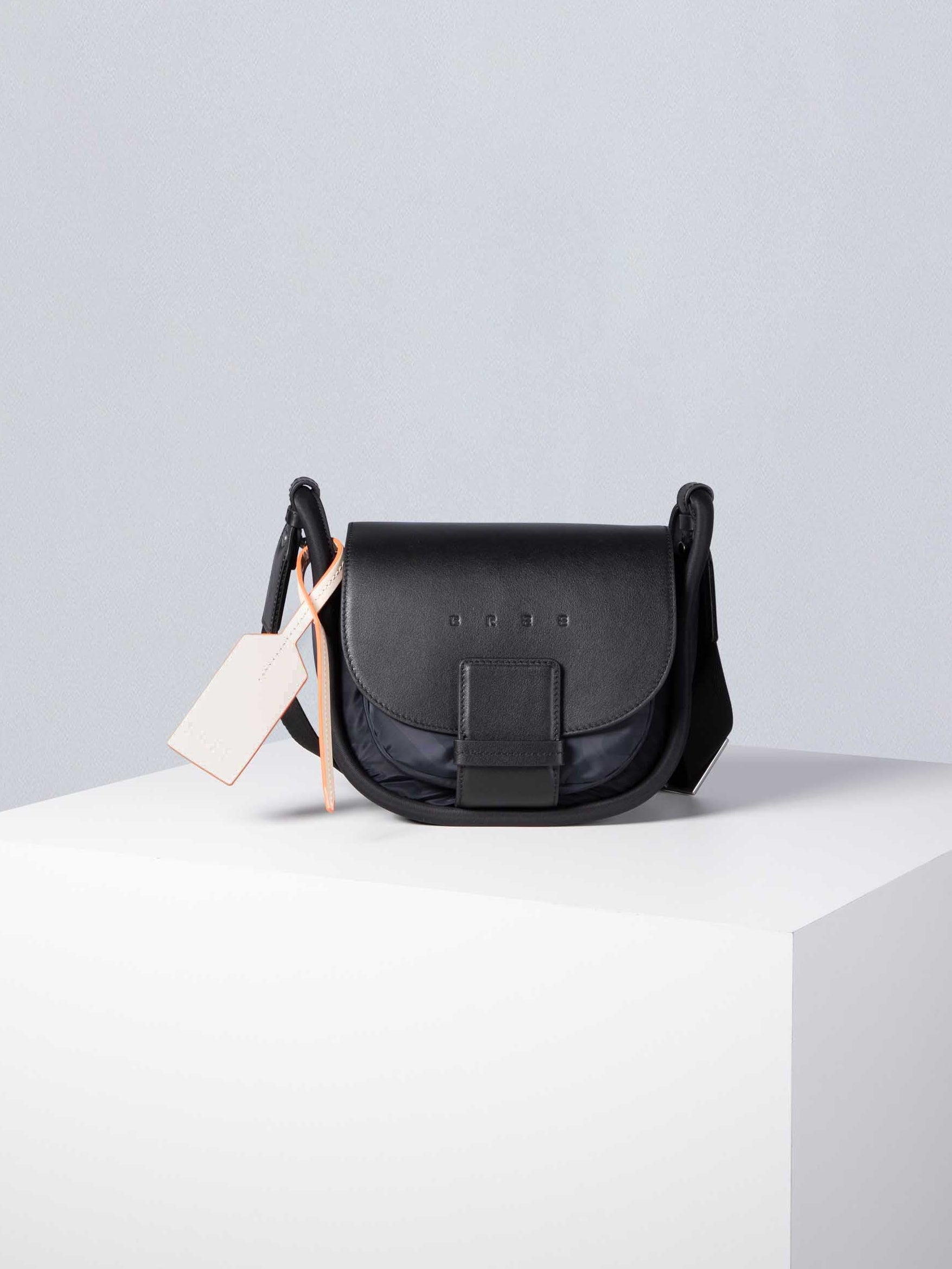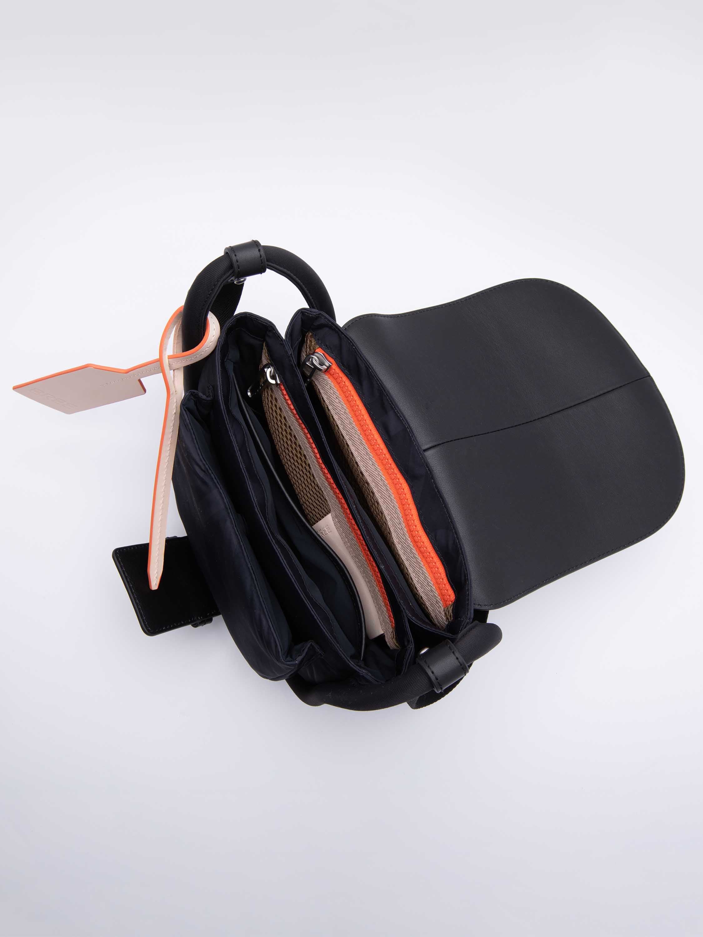 Innen bleibt alles klar strukturiert: drei Mesh-Fächer, ein Fach mit orangefarbenem Reißverschluss sowie die ikonische BREE-Leash sorgen für Ordnung. Das Hauptfach bietet Platz für tägliche Essentials inklusive iPad mini, ohne die klare Form zu verlieren.