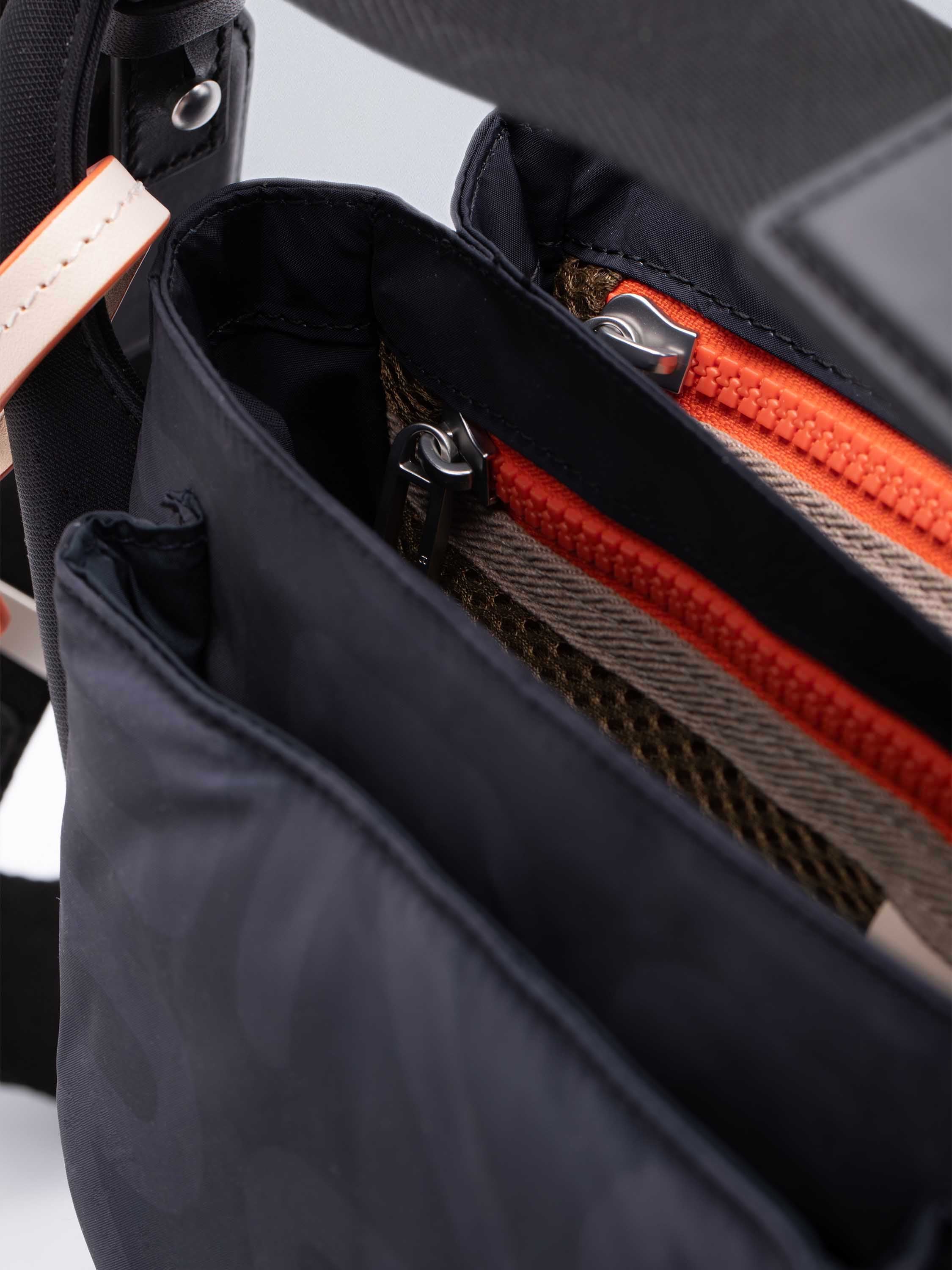 - Innenfächer: 3 Mesh-Fächer + 1 Reißverschlussfach mit orangefarbenem Zip.