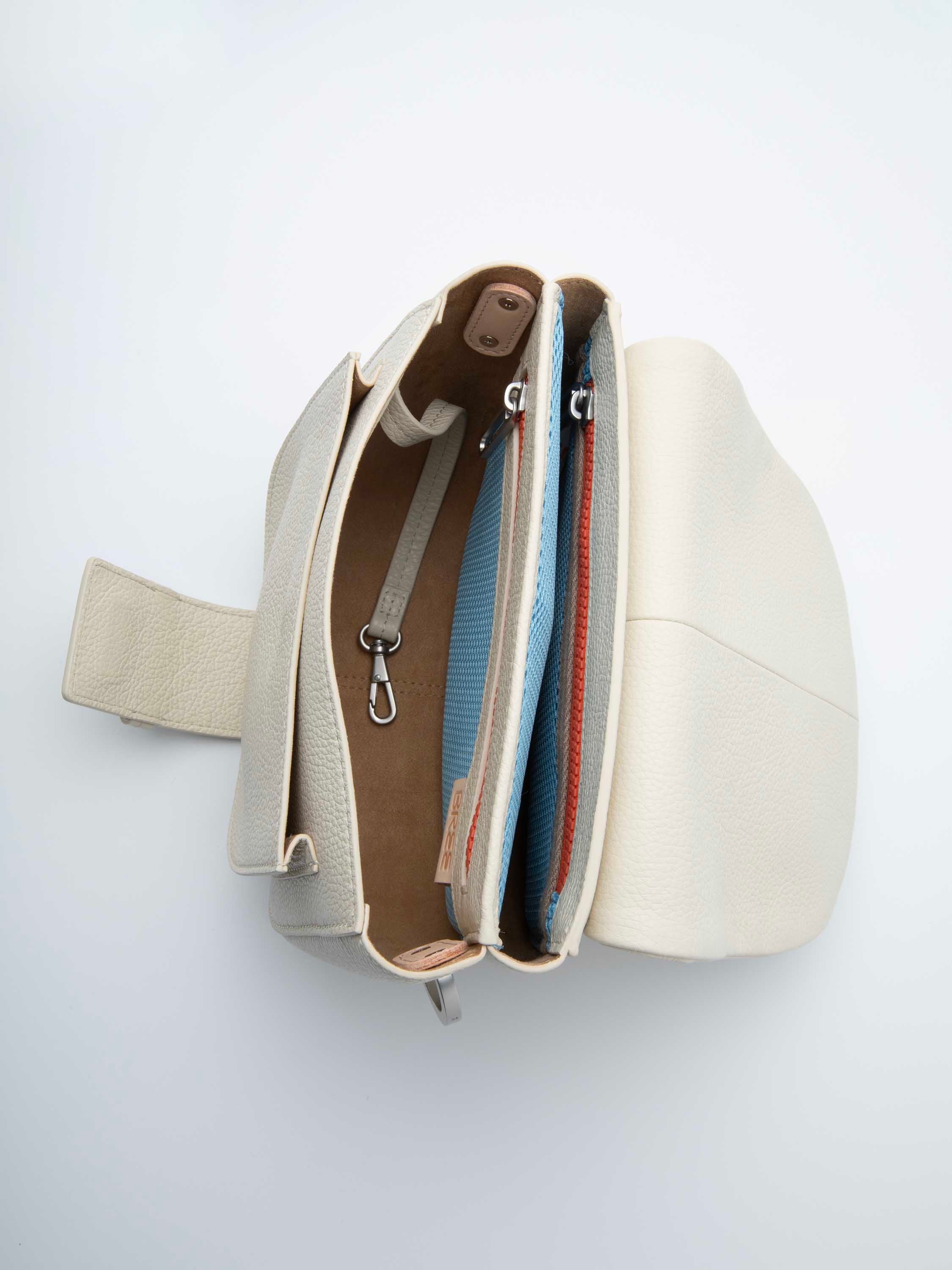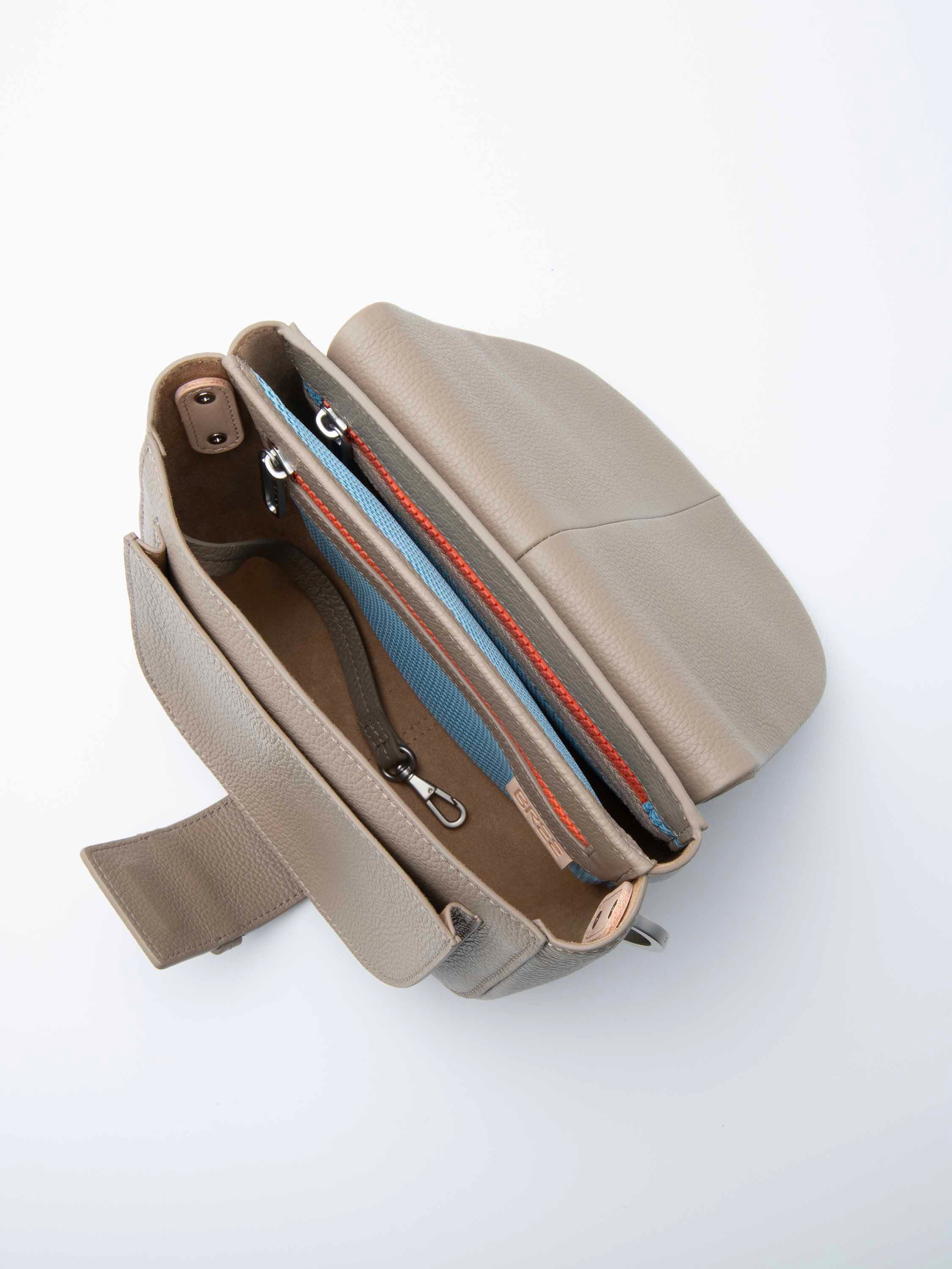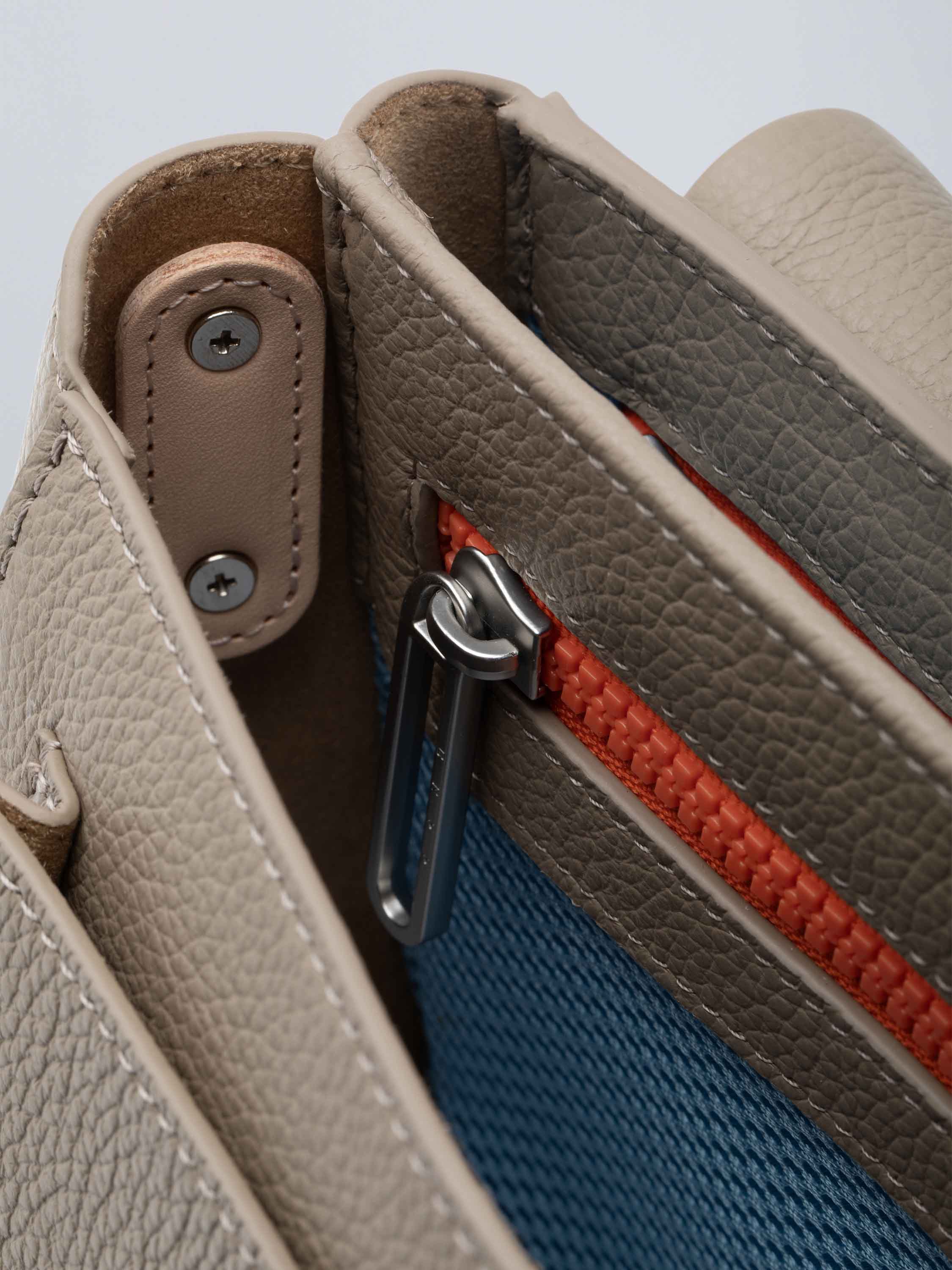 Innen bleibt alles übersichtlich – drei Mesh-Fächer, ein Fach mit orangefarbenem Reißverschluss, ein Schlüsselband und genügend Platz für Essentials inklusive iPad mini. Die Struktur wirkt klar, ohne die Leichtigkeit der Form zu verlieren.